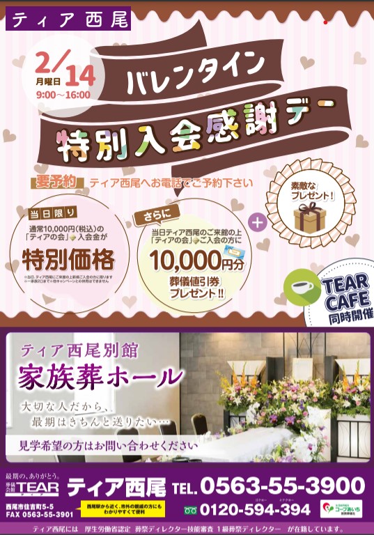 2022年2月9日 / 最終更新日時 : 2022年2月28日 skmgnishio イベント 2月14日(月)バレンタイン特別入会感謝デーを開催いたします。 2月14日(月)ティア西尾では、バレンタイン特別入会感謝デーを開催いたします。 詳しくはコチラ↓↓↓