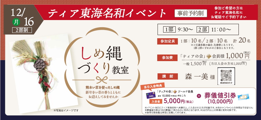 2024年11月26日 / 最終更新日時 : 2024年12月30日 skmgtokai イベント 12月16日(月)しめ縄づくり教室を開催します 12月16日(月)ティア東海名和では、しめ縄づくり教室を開催いたします。 詳しくはコチラ↓↓↓